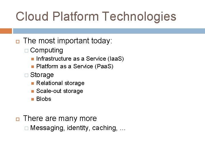 Cloud Platform Technologies The most important today: � Computing Infrastructure as a Service (Iaa. S) Platform as a Service (Paa. S) � Storage Relational storage Scale-out storage Blobs There are many more � Messaging, identity, caching, …