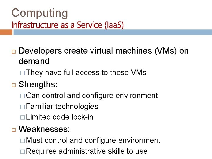 Computing Infrastructure as a Service (Iaa. S) Developers create virtual machines (VMs) on demand � They have full access to these VMs Strengths: � Can control and configure environment � Familiar technologies � Limited code lock-in Weaknesses: � Must control and configure environment � Requires administrative skills to use