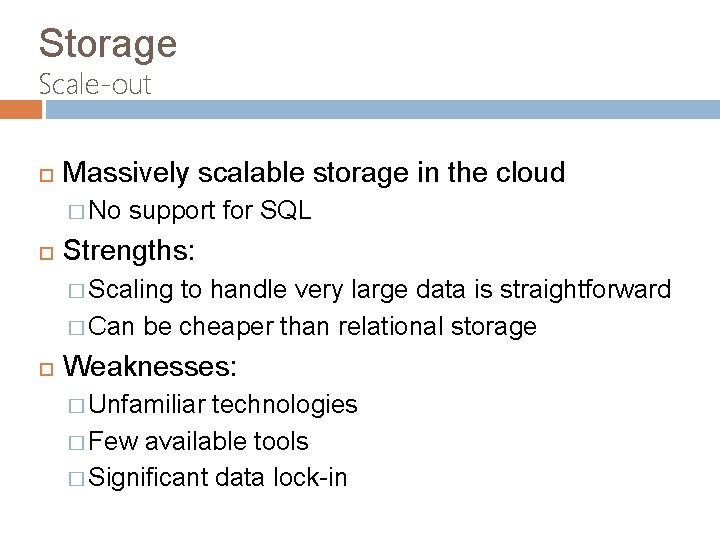 Storage Scale-out Massively scalable storage in the cloud � No support for SQL Strengths: � Scaling to handle very large data is straightforward � Can be cheaper than relational storage Weaknesses: � Unfamiliar technologies � Few available tools � Significant data lock-in