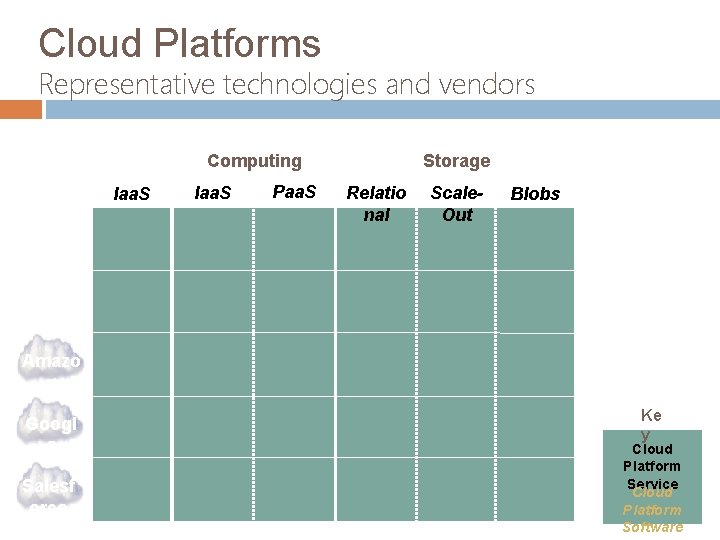 Cloud Platforms Representative technologies and vendors Public Private Storage Computing Iaa. S Paa. S Relatio nal Scale. Out Blobs Micros oft VMwar e Amazo n Googl e Salesf orce Ke y Cloud Platform Service Cloud Platform Software
