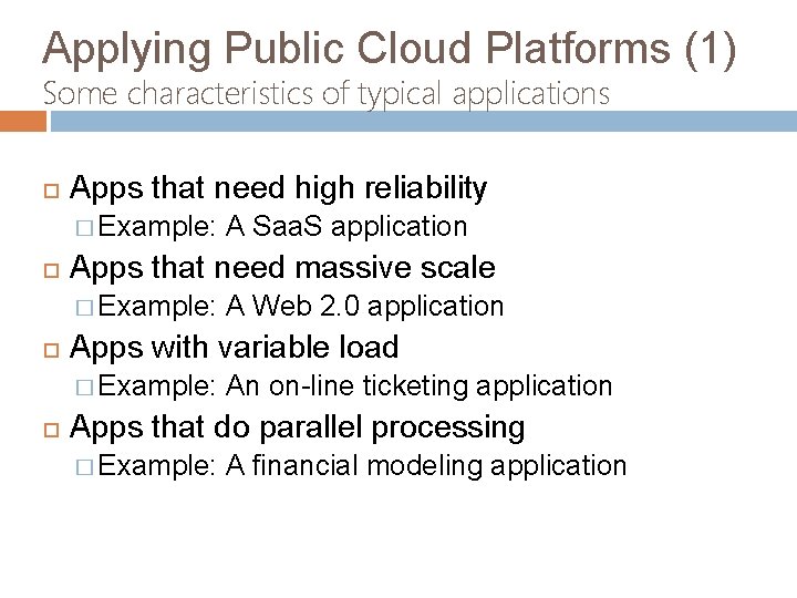 Applying Public Cloud Platforms (1) Some characteristics of typical applications Apps that need high reliability � Example: Apps that need massive scale � Example: A Web 2. 0 application Apps with variable load � Example: A Saa. S application An on-line ticketing application Apps that do parallel processing � Example: A financial modeling application