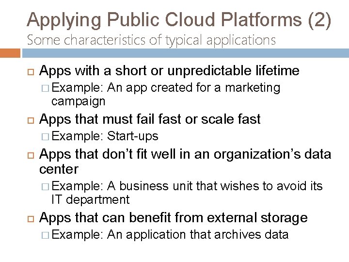 Applying Public Cloud Platforms (2) Some characteristics of typical applications Apps with a short or unpredictable lifetime � Example: campaign Apps that must fail fast or scale fast � Example: An app created for a marketing Start-ups Apps that don’t fit well in an organization’s data center � Example: A business unit that wishes to avoid its IT department Apps that can benefit from external storage � Example: An application that archives data