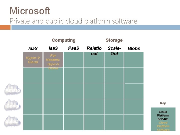 Microsoft Private and public cloud platform software Public Private Storage Computing Iaa. S Micros oft Hyper-V Cloud Iaa. S For Hosters: Paa. S Relatio nal Scale. Out Blobs Hyper-V Cloud VMwar e Amazo n Googl e Salesf orce Key Cloud Platform Service Cloud Platform Software