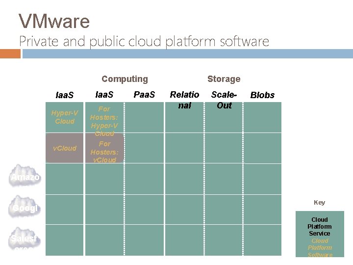 VMware Private and public cloud platform software Public Private Storage Computing Iaa. S Micros oft VMware Hyper-V Cloud v. Cloud Iaa. S For Hosters: Hyper-V Cloud For Hosters: v. Cloud Paa. S Relatio nal Scale. Out Blobs Amazo n Googl e Salesf orce Key Cloud Platform Service Cloud Platform Software