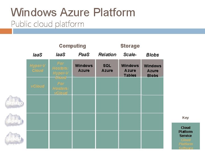 Windows Azure Platform Public cloud platform Public Private Storage Computing Iaa. S Micros oft VMwar e Hyper-V Cloud v. Cloud Iaa. S For Hosters: Hyper-V Cloud For Hosters: v. Cloud Paa. S Relation al Scale. Out Blobs Windows Azure SQL Azure Windows Azure Tables Windows Azure Blobs Amazo n Googl e Salesf orce Key Cloud Platform Service Cloud Platform Software