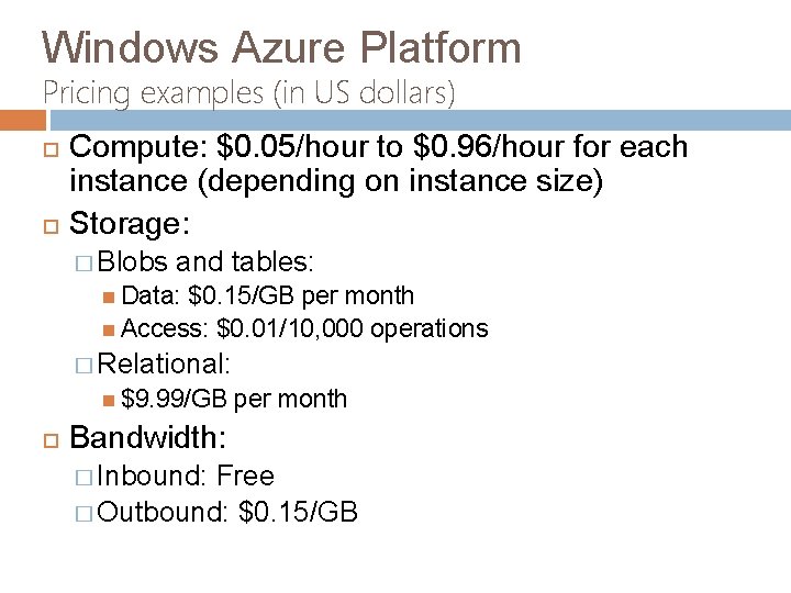 Windows Azure Platform Pricing examples (in US dollars) Compute: $0. 05/hour to $0. 96/hour for each instance (depending on instance size) Storage: � Blobs and tables: Data: $0. 15/GB per month Access: $0. 01/10, 000 operations � Relational: $9. 99/GB per month Bandwidth: � Inbound: Free � Outbound: $0. 15/GB