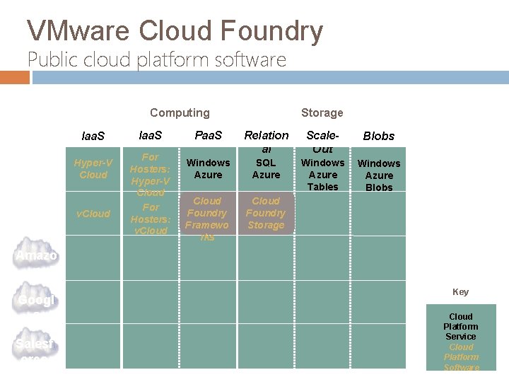 VMware Cloud Foundry Public cloud platform software Public Private Storage Computing Iaa. S Micros oft VMwar e Hyper-V Cloud v. Cloud Iaa. S For Hosters: Hyper-V Cloud For Hosters: v. Cloud Paa. S Relation al Scale. Out Blobs Windows Azure SQL Azure Windows Azure Tables Windows Azure Blobs Cloud Foundry Framewo rks Cloud Foundry Storage Amazo n Googl e Salesf orce Key Cloud Platform Service Cloud Platform Software