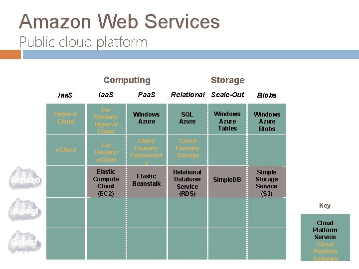 Amazon Web Services Public cloud platform Public Private Storage Computing Micros oft VMwar e Amazo n Googl e Salesf orce Iaa. S Paa. S Hyper-V Cloud For Hosters: Hyper-V Cloud Windows Azure SQL Azure v. Cloud For Hosters: v. Cloud Foundry Framework s Cloud Foundry Storage Elastic Compute Cloud (EC 2) Elastic Beanstalk Relational Scale-Out Relational Database Service (RDS) Windows Azure Tables Simple. DB Blobs Windows Azure Blobs Simple Storage Service (S 3) Key Cloud Platform Service Cloud Platform Software