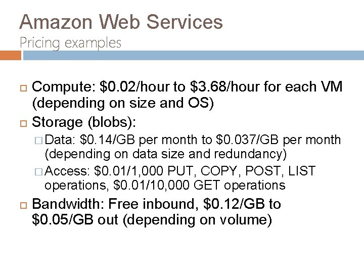 Amazon Web Services Pricing examples Compute: $0. 02/hour to $3. 68/hour for each VM (depending on size and OS) Storage (blobs): � Data: $0. 14/GB per month to $0. 037/GB per month (depending on data size and redundancy) � Access: $0. 01/1, 000 PUT, COPY, POST, LIST operations, $0. 01/10, 000 GET operations Bandwidth: Free inbound, $0. 12/GB to $0. 05/GB out (depending on volume)