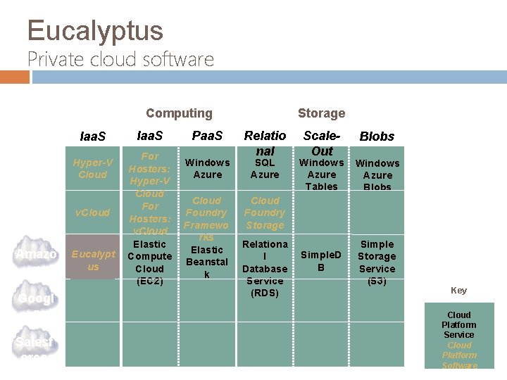 Eucalyptus Private cloud software Public Private Storage Computing Iaa. S Micros oft VMwar e Amazo n Googl e Salesf orce Hyper-V Cloud v. Cloud Eucalypt us Iaa. S For Hosters: Hyper-V Cloud For Hosters: v. Cloud Elastic Compute Cloud (EC 2) Paa. S Windows Azure Cloud Foundry Framewo rks Elastic Beanstal k Relatio nal SQL Azure Scale. Out Blobs Windows Azure Tables Windows Azure Blobs Simple. D B Simple Storage Service (S 3) Cloud Foundry Storage Relationa l Database Service (RDS) Key Cloud Platform Service Cloud Platform Software