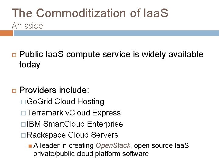 The Commoditization of Iaa. S An aside Public Iaa. S compute service is widely available today Providers include: � Go. Grid Cloud Hosting � Terremark v. Cloud Express � IBM Smart. Cloud Enterprise � Rackspace Cloud Servers A leader in creating Open. Stack, open source Iaa. S private/public cloud platform software