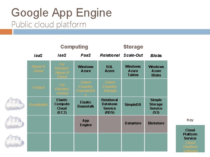 Google App Engine Public cloud platform Public Private Storage Computing Micros oft VMwar e Amazo n Googl e Salesf orce Iaa. S Paa. S Hyper-V Cloud For Hosters: Hyper-V Cloud Windows Azure SQL Azure v. Cloud For Hosters: v. Cloud Foundry Framework s Cloud Foundry Storage Eucalyptus Elastic Compute Cloud (EC 2) Elastic Beanstalk App Engine Relational Scale-Out Relational Database Service (RDS) Windows Azure Tables Simple. DB Datastore Blobs Windows Azure Blobs Simple Storage Service (S 3) Blobstore Key Cloud Platform Service Cloud Platform Software