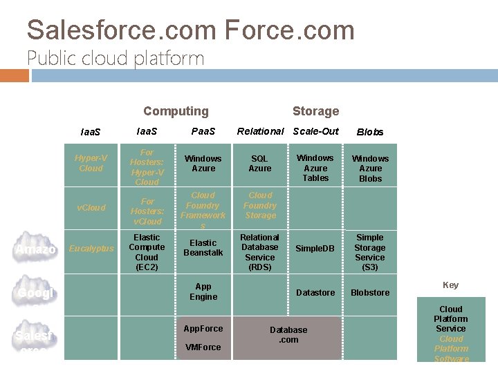 Salesforce. com Force. com Public cloud platform Public Private Storage Computing Micros oft VMwar e Amazo n Googl e Salesf orce Iaa. S Paa. S Hyper-V Cloud For Hosters: Hyper-V Cloud Windows Azure SQL Azure v. Cloud For Hosters: v. Cloud Foundry Framework s Cloud Foundry Storage Eucalyptus Elastic Compute Cloud (EC 2) Elastic Beanstalk App Engine App. Force VMForce Relational Scale-Out Relational Database Service (RDS) Windows Azure Tables Simple. DB Datastore Database. com Blobs Windows Azure Blobs Simple Storage Service (S 3) Blobstore Key Cloud Platform Service Cloud Platform Software