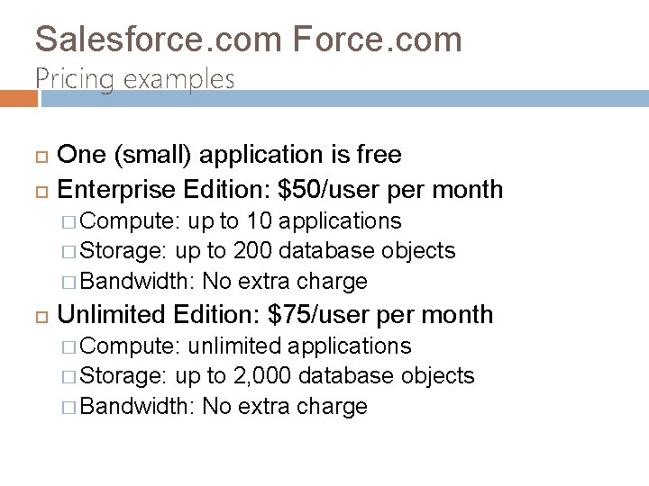 Salesforce. com Force. com Pricing examples One (small) application is free Enterprise Edition: $50/user per month � Compute: up to 10 applications � Storage: up to 200 database objects � Bandwidth: No extra charge Unlimited Edition: $75/user per month � Compute: unlimited applications � Storage: up to 2, 000 database objects � Bandwidth: No extra charge
