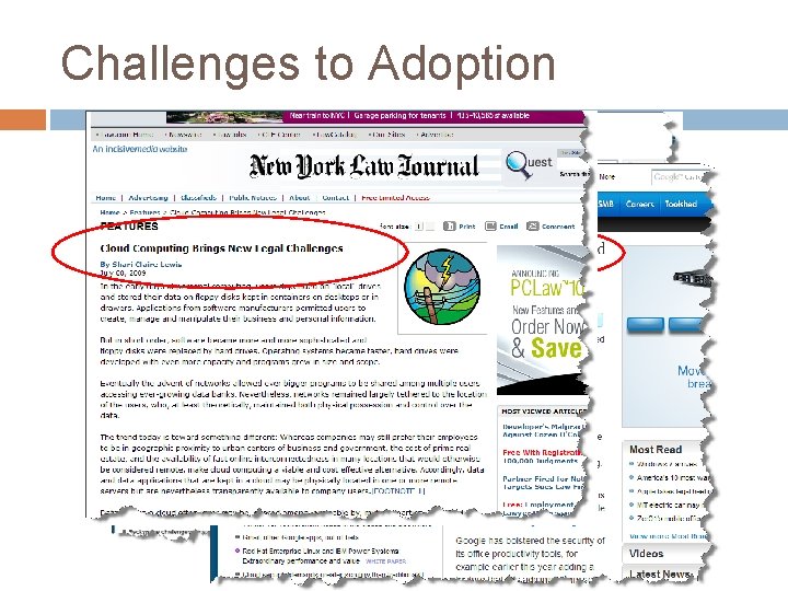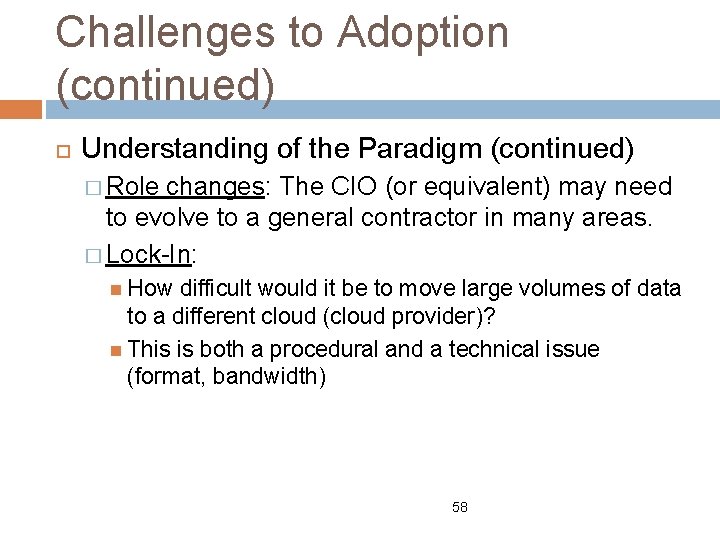 Challenges to Adoption (continued) Understanding of the Paradigm (continued) � Role changes: The CIO (or equivalent) may need to evolve to a general contractor in many areas. � Lock-In: How difficult would it be to move large volumes of data to a different cloud (cloud provider)? This is both a procedural and a technical issue (format, bandwidth) 58