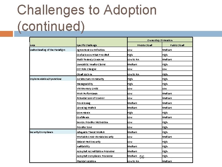 Challenges to Adoption (continued) Area Specific Challenge Ownership Dimension Private Cloud Public Cloud Understanding of the Paradigm Agreement on Definition Low Medium Confusion on What Provided High Multi-Tenancy Concerns Low to NA Medium Unrealistic Vendor Claims Medium High CIO Role Changes Low Cloud Lock-In Low to NA High Implementation/Operations Architecture Immaturity High Manageability High VM Memory Limits Low WAN Performance Low Medium Potential Loss of Control Low Medium Provisioning Medium Licensing Models Medium Governance High Confidence Low Medium Service Provider Motivation Low High Provider SLAs Low High Security/Compliance Adequate Threat Models Medium High Workable Cross-Domain Security Low Medium Data-at-Rest Security Low High Auditability Medium High Accepted Accreditation Processes Medium High Accepted Compliance Processes Medium Physical Location Low to NA 56 High Medium