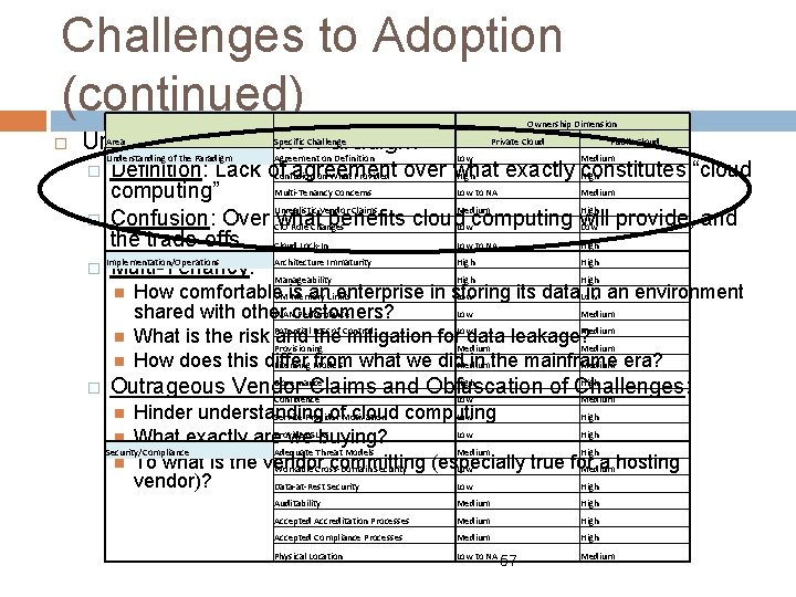 Challenges to Adoption (continued) Security and Compliance (continued) � Compliance: May preclude cloud paradigm in some cases due to: � Physical Location: Physical chain of custody requirements Regulatory requirements Do you know what country your cloud resides in? Would you know if it changed? What compliance requirements change? Is there governing law that recognizes the paradigm? Conclusions: There are many challenges to adoption of the cloud paradigm � Public clouds and private clouds have different sets of challenges, with some overlap � 64