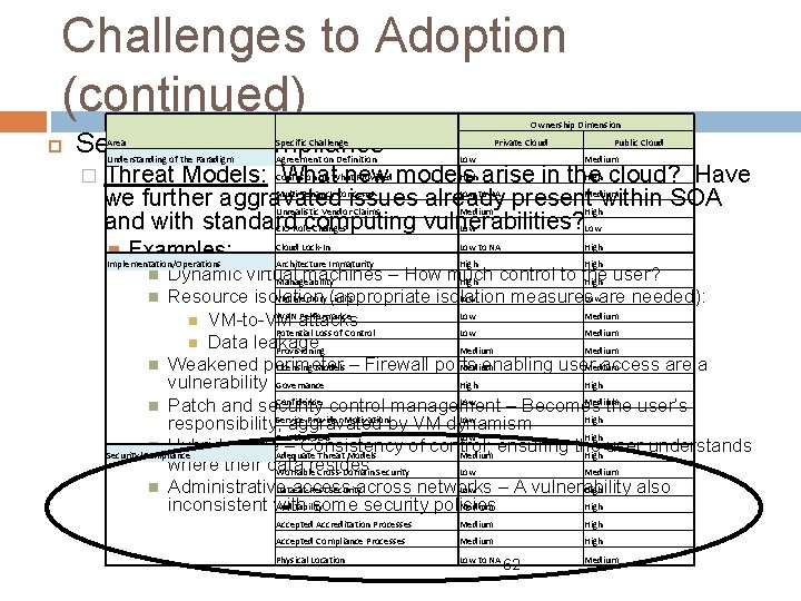 Challenges to Adoption (continued) Implementation and Operations (continued) � Motivation for the Provider: Ideally, providers keep just ahead of demand May provide motivation for providers to federate and sell capacity to each other as do utility companies. Are there lessons from the power utility companies? Aggravates manageability problem Is the capacity really there for surge levels? Will another tenant’s surge impede your ability to do the same? � Service-Level Agreements: There have been effectively no substantive guarantees from public cloud providers. 61