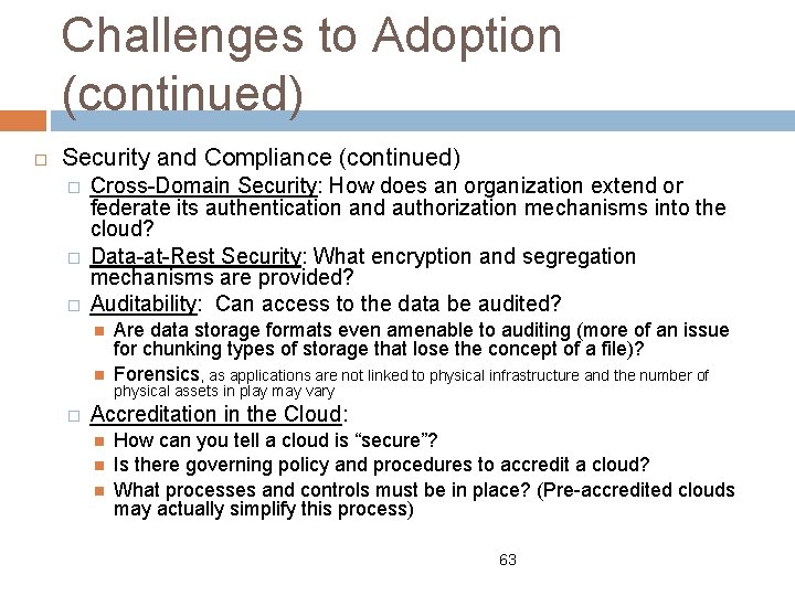 Challenges to Adoption (continued) Security and Compliance (continued) � � � Cross-Domain Security: How does an organization extend or federate its authentication and authorization mechanisms into the cloud? Data-at-Rest Security: What encryption and segregation mechanisms are provided? Auditability: Can access to the data be audited? � Are data storage formats even amenable to auditing (more of an issue for chunking types of storage that lose the concept of a file)? Forensics, as applications are not linked to physical infrastructure and the number of physical assets in play may vary Accreditation in the Cloud: How can you tell a cloud is “secure”? Is there governing policy and procedures to accredit a cloud? What processes and controls must be in place? (Pre-accredited clouds may actually simplify this process) 63
