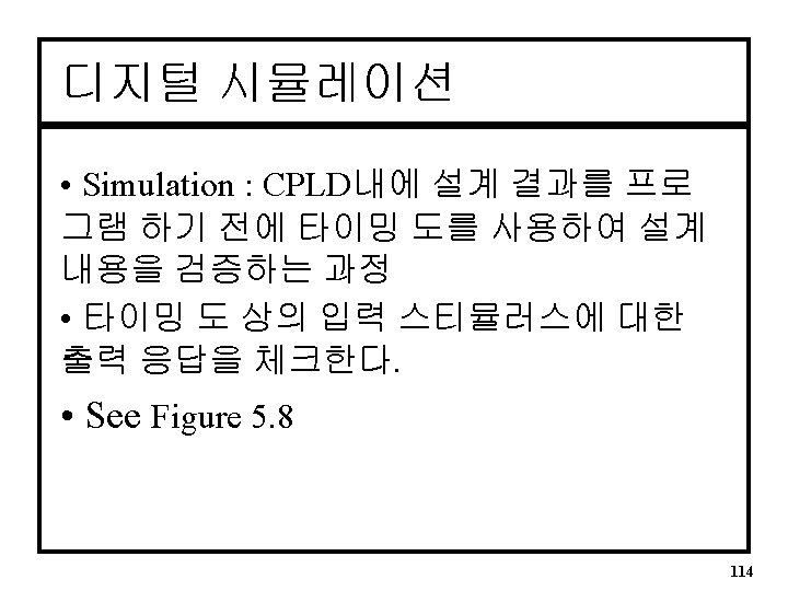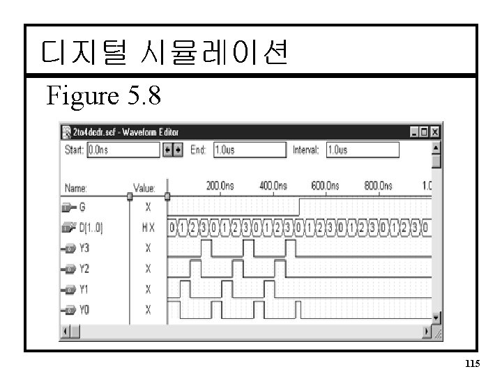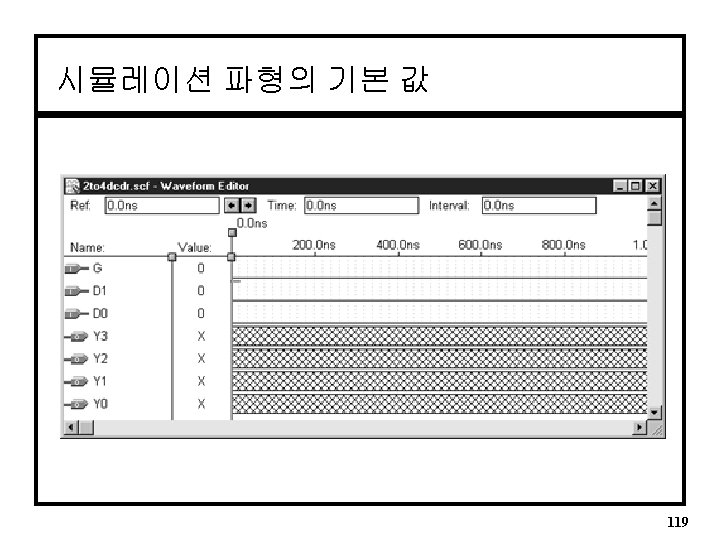 MAX+PLUSII 시뮬레이션 q 기본과정 1. Enter Nodes from SNF (on Node Menu) 2. Set End Time (File Menu) for length (default = 1. 0 us) 3. Set Grid Size (Options Menu) : 시뮬레이션 시 최 소시간을 결정 • Fig. 5. 9 ~ 5. 15 참조 4. Use Toolbar to set input stimulus 5. Open Simulator Engine, Press Start 116