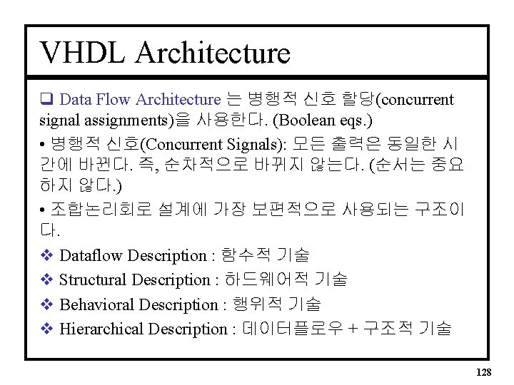 2 to 4 디코더의 VHDL Architecture -- Use Concurrent Signal Assignment ARCHITECTURE decoder OF decode 1 IS BEGIN Y 0 <= (not D 1) and (not D 0); Y 1 <= (not D 1) and (D 0); Y 2 <= (D 1) and (not D 0); Y 3 <= (D 1) and (D 0); END decoder; 127