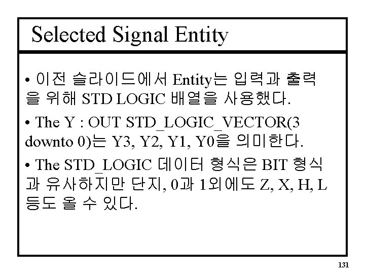디코더의 VHDL Entity • Basic Entity for Selected Signal ENTITY decode 1 IS PORT( D Y : IN STD_LOGIC_VECTOR(1 downto 0); : OUT STD_LOGIC_VECTOR(3 downto 0)); END decode 1; 130