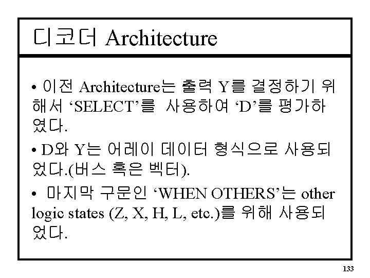 Selected Signal Architecture • Basic Architecture ARCHITECTURE decoder OF decode 1 IS BEGIN WITH D SELECT Y <= “ 0001” WHEN “ 00”, “ 0010” WHEN “ 01”, “ 0100” WHEN “ 10”, “ 1000” WHEN “ 11”, “ 0000” WHEN OTHERS; END decoder; 132