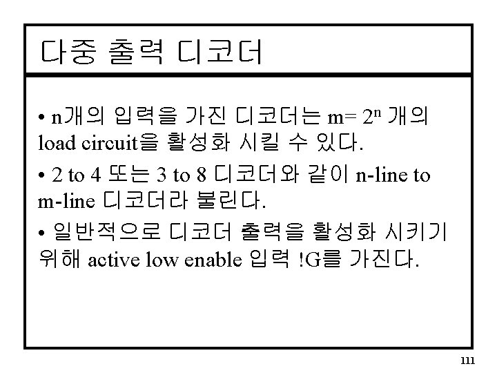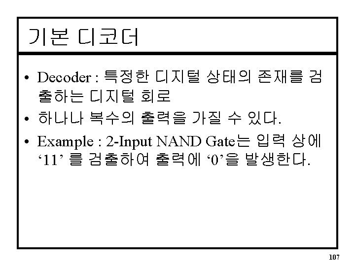 단원목차 1. 디코더(Decoders) 2. 엔코더(Encoders) 3. 멀티플렉서(Multiplexers) 4. 디멀티플렉서(Demultiplexers) 5. 크기 비교기(Magnitude Comparators) 6. 패리티 생성기 및 검사기(Parity Generators and Checkers) 106