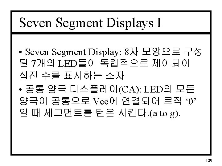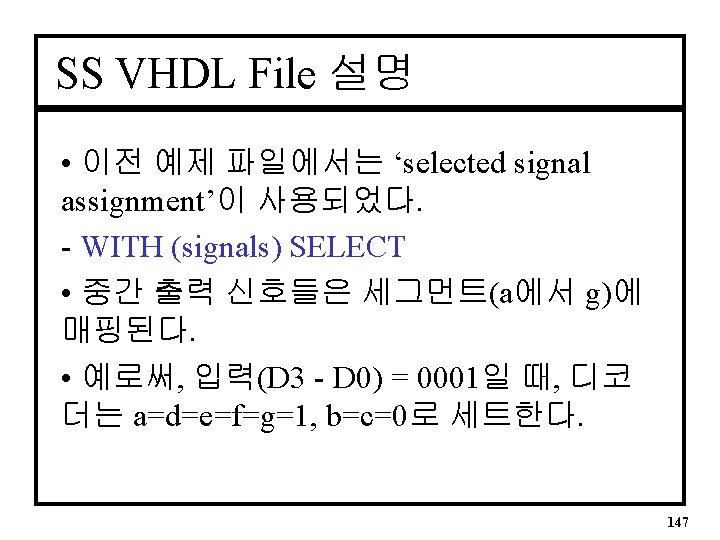 SS VHDL Architecture (CA) III • SS Architecture(계속) a <= output(6); b <= output(5); c <= output(4); d <= output(3); e <= output(2); f <= output(1); g <= output(0); END seven_segment; 146