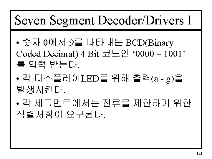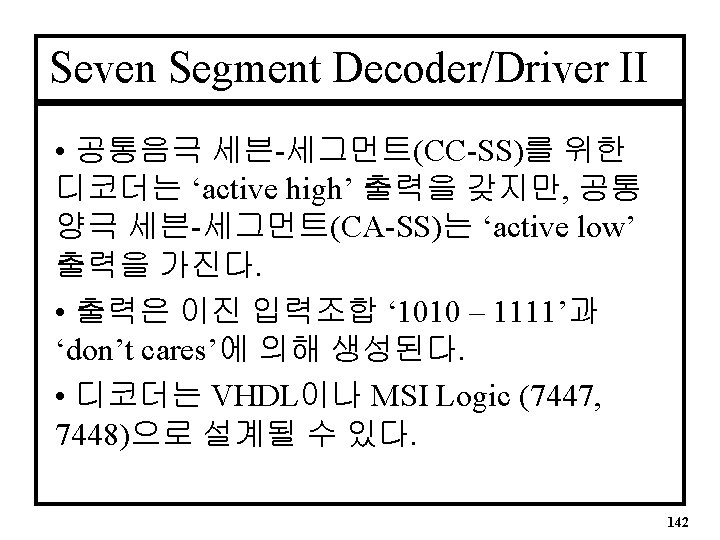 SS Decoder Entity • Basic Entity ENTITY bcd_7 seg IS PORT( d 3, d 2, d 1, d 0 a, b, c, d, e, f, g : IN BIT; : OUT BIT); END bcd_7 seg; -- Defines binary inputs d 0 to d 3 -- Defines SS outputs a to g 143