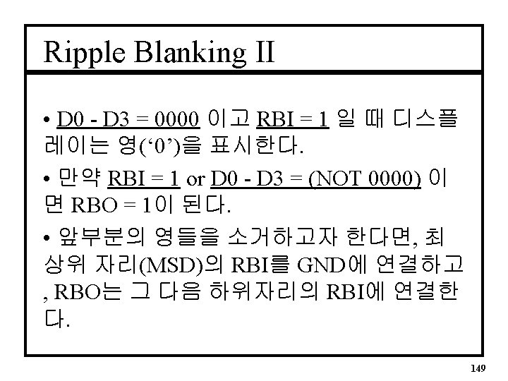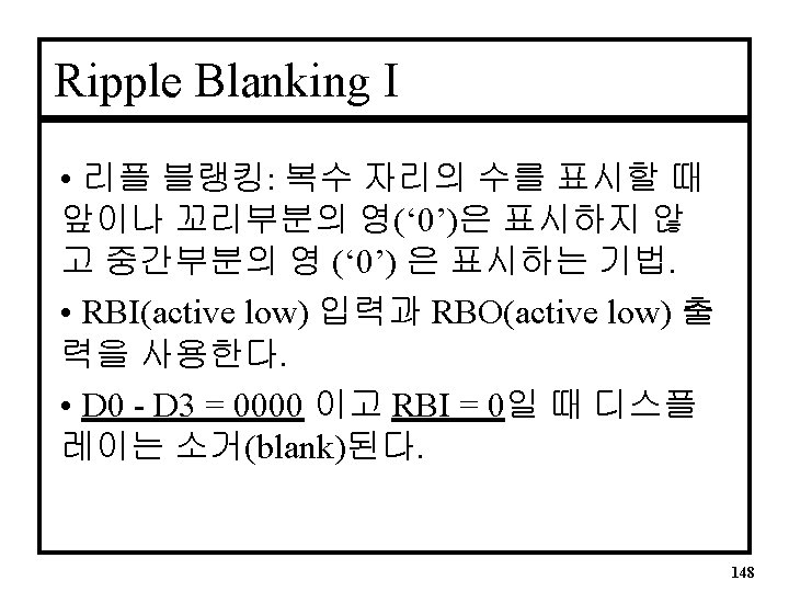 Ripple Blanking Process구문 I • 이전 파일에 기본 프로세스 구문이 더해진다. (sevsegrb. vhd) PROCESS(n. RBI, input) BEGIN IF(input = “ 0000” and n. RBI = ‘ 0’) THEN output <= “ 1111111”; -- Suppressed 0 n. RBO <= ‘ 0’; ELSIF(input = “ 0000” and n. RBI = ‘ 1’) THEN output <= “ 0000001”; -- Display a 0 n. RBO <= ‘ 1’; ELSE -- Continued on next slide 153