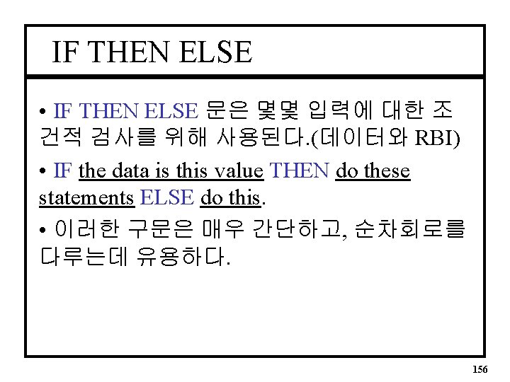 CASE 문 • SS 디스플레이를 위한 출력을 발생시키기 위해 리플 블랭킹 설계에서 선택적 신호 할 당문(With Select)을 Case문으로 교체 했다. • The Process Steps are evaluated in sequence first the IF statements, then the Case and so on. 155