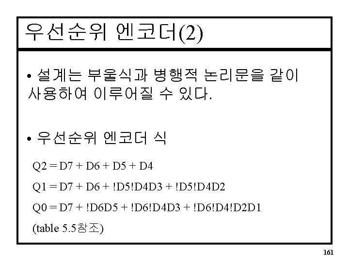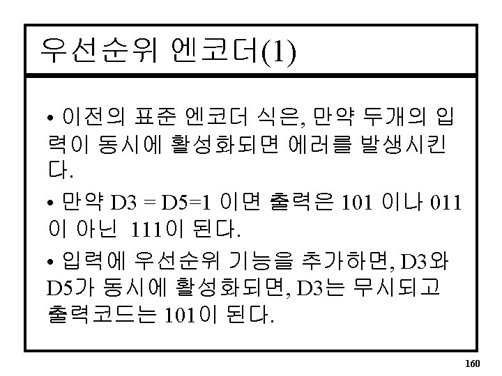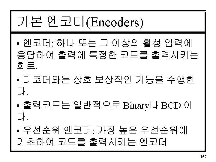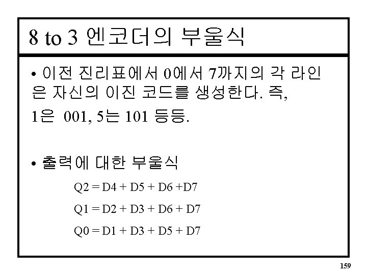 8 to 3 엔코더 진리표 • 입력은 Active High D 7 D 6 D 5 D 4 D 3 D 2 D 1 D 0 Q 2 Q 1 Q 0 0 0 0 1 0 0 0 0 0 1 0 0 0 0 1 0 0 1 1 | 0 0 | 0 1 158