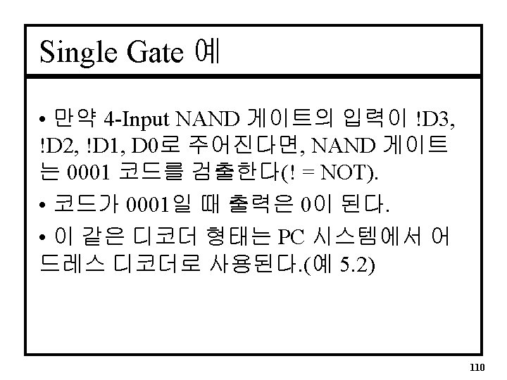 Single Gate 디코더(1) • 단일 게이트(AND/NAND)와 몇 몇 Inverter 를 사용한다. • Example: 4 -Input AND는 입력에 ‘ 1111’를 검출하여 출력에 ‘ 1’을 발생시킨다. • 입력은 D 3, D 2, D 1, D 0로 표기되고, D 3는 MSB(most significant bit), D 0는 LSB (least significant bit)가 된다. • See Figure 5. 1 108