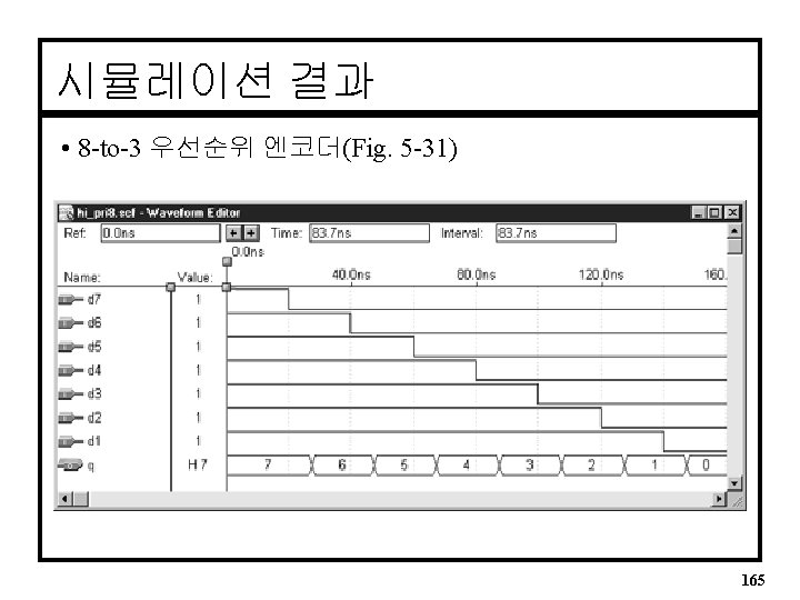 다른 VHDL Encoder(2) • If-Then-Else문은 반드시 PROCESS문 내에만 사용된다. ENTITY hi_pri 8 a IS PORT( d : IN BIT_VECTOR(7 downto 0); q : OUT INTEGER RANGE 0 to 7); END hi_pri 8 a ; ARCHITECTURE a OF hi_pri 8 b IS BEGIN PROCESS (d) BEGIN IF (d(7) = ‘ 1’) THEN q <= 7; ELSIF (d(6) = ‘ 1’) THEN q <= 6; --ELSIF (d(1) = ‘ 1’) THEN q <= 1; ELSE q <= 0; ENDIF; END PROCESS; END a; 164