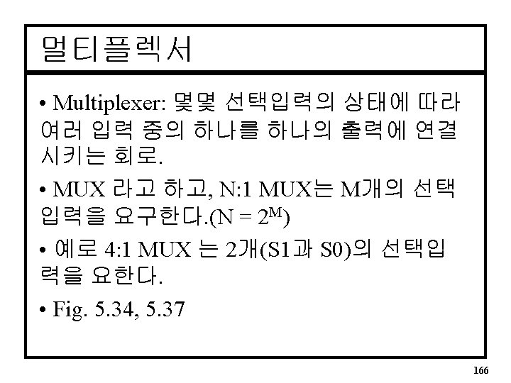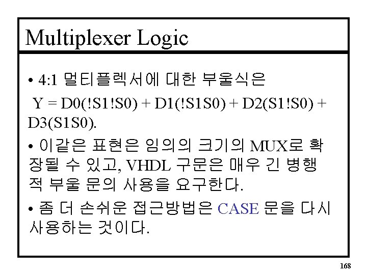 4: 1 Multiplexers (Fig 5. 34 & 5. 37) Y = D 0!S 1!S 0 + D 1!S 1 S 0 + D 2 S 1!S 0 + D 3 S 1 S 0 167