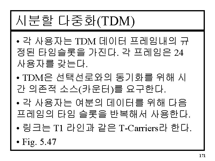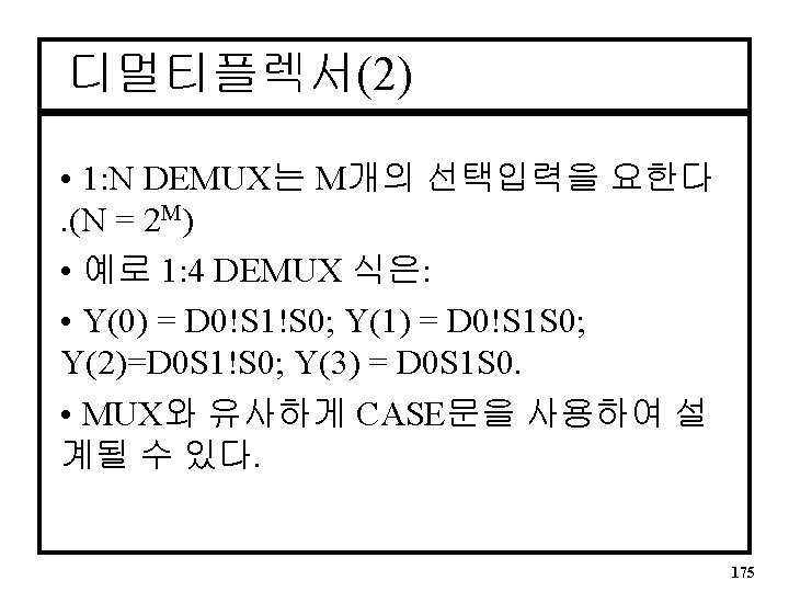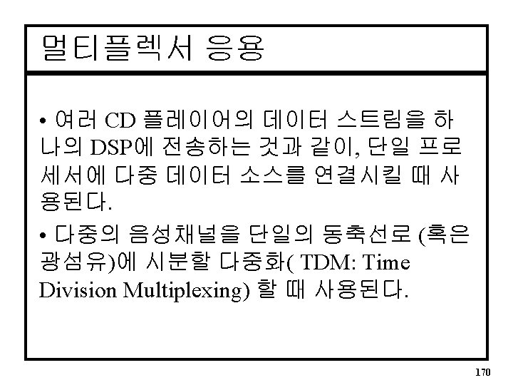 4: 1 MUX(프로세스내의 case문) ARCHITECTURE mux 4 to 1 OF mux 4 case IS BEGIN PROCESS(S) -- Process is sensitive to S (S 1, S 0) Selects BEGIN CASE S IS WHEN “ 00” => Y <= D 0; WHEN “ 01” => Y <= D 1; WHEN “ 10” => Y <= D 2; WHEN “ 11” => Y <= D 3; WHEN OTHERS => Y <= ‘ 0’; END CASE; END PROCESS; END mux 4 to 1; 169