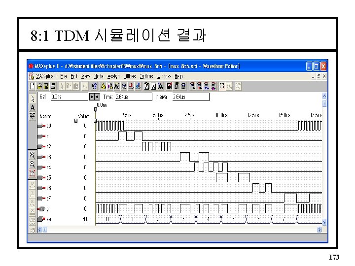 8: 1 TDM ENTITY mux_8 ch IS PORT( sel : IN BIT_VECTOR(2 downto 0); d : IN BIT_VECTOR(7 downto 0); y : OUT BIT); END mux_8 ch; ARCHITECTURE a OF mux_8 ch IS BEGIN -- Selected Signal Assignment MUX 8: WITH sel SELECT y <= d(0) WHEN "000", d(1) WHEN "001", d(2) WHEN "010", d(3) WHEN "011", d(4) WHEN "100", d(5) WHEN "101", d(6) WHEN "110", d(7) WHEN "111"; END a; 172