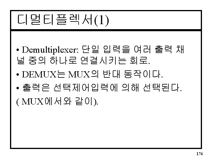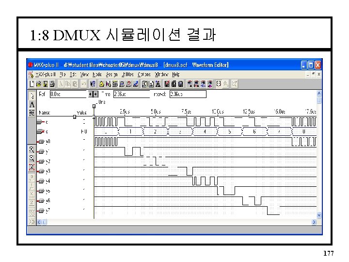 1: 8 DMUX ENTITY dmux 8 IS PORT( s : IN d : IN y : OUT INTEGER Range 0 to 7; BIT_VECTOR (0 to 7)); END dmux 8; ARCHITECTURE a OF dmux 8 IS SIGNAL output : BIT_VECTOR(0 to 7); BEGIN PROCESS (d, s) BEGIN IF (d = '1') THEN output <= "1111"; ELSE CASE s IS WHEN 0 => output <= "01111111"; WHEN 1 => output <= "10111111"; WHEN 2 => output <= "11011111"; WHEN 3 => output <= "11101111"; WHEN 4 => output <= "11110111"; WHEN 5 => output <= "11111011"; WHEN 6 => output <= "11111101"; WHEN 7 => output <= "11111110"; WHEN OTHERS => output <= "1111"; END CASE; END IF; y <= output; END PROCESS; END a; 176