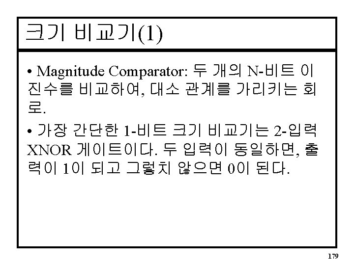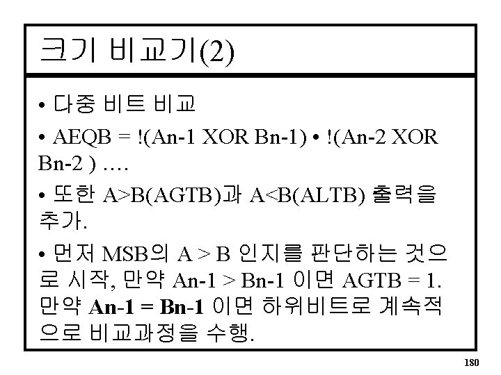 4 -Bit 크기 비교기 VHDL(behavioral) LIBRARY ieee; USE ieee. std_logic_1164. ALL; ENTITY compare 4 IS PORT( a, b : IN INTEGER RANGE 0 TO 15; -- for 8 -bit 0 TO 255 agtb, aeqb, altb : OUT STD_LOGIC); END compare 4; ARCHITECTURE a OF compare 4 IS SIGNAL compare : STD_LOGIC_VECTOR(2 downto 0); BEGIN 182