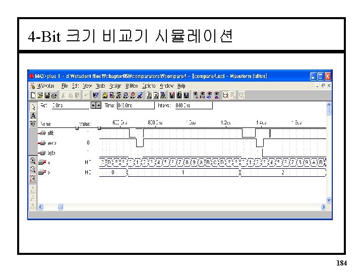 4 -Bit 크기 비교기 VHDL(계속) PROCESS (a, b) -- Sensitive to A and B Integer Arrays BEGIN IF a < b THEN compare <= “ 110”; q Relational operators ELSIF a = b THEN = = compare <= “ 101”; ¹ /= ELSIF a > b THEN ³ >= compare <= “ 011”; <= ELSE compare <= “ 111”; END IF; agtb <= compare(2); aeqb <= compare(1); altb <= compare(0); END PROCESS; END a; in VHDL 183