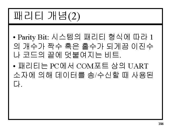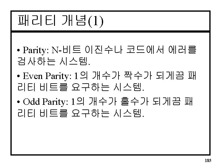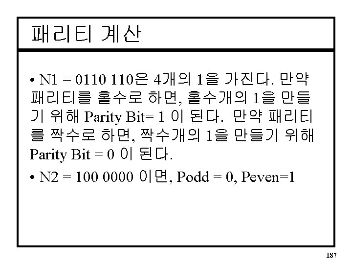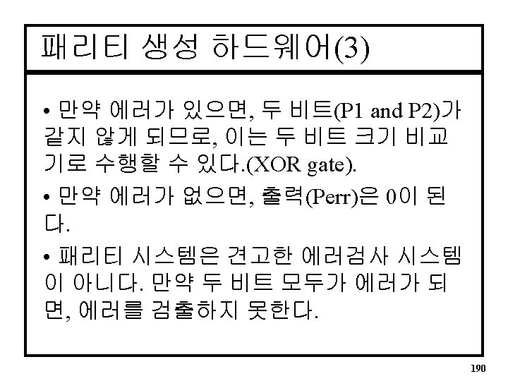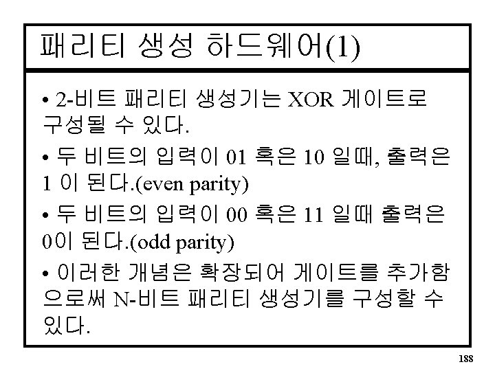 패리티VHDL Architecture • Six Bit Parity Generator ARCHITECTURE par OF pargen IS BEGIN parev <= A 0 XOR A 1 XOR A 2 XOR A 3 XOR A 4 XOR A 5; END par; 191
