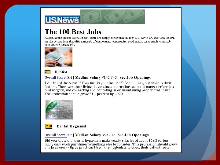 REASONS STUDENTS CHOOSE DENTISTRY Source: American Dental Education Association, 2010