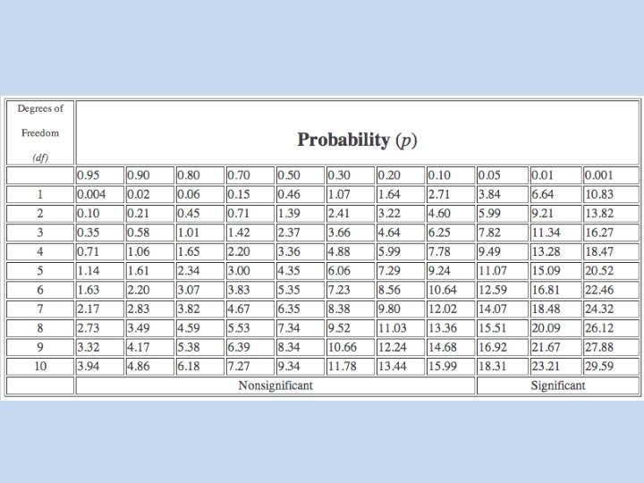 1. Determine number of each phenotype observed and how many would be expected given basic genetic theory 2. Calculate chi-square statistic using this formula. You need to memorize the formula! - “Χ” is Greek letter chi - “∑” is a sigma; it means to sum the following terms for all phenotypes. -“obs” is the number of individuals of the given phenotype observed - “exp” is the number of that phenotype expected from the null hypothesis. • Note that you must use the number of individuals, the counts, and NOT proportions, ratios, or frequencies. 3. State conclusion - If p value for calculate x 2 is p > 0. 05, ACCEPT your hypothesis - Ex: If p=. 0. 6, then there is a 60% chance your results are due to chance, NOT something else - If p value for calculate x 2 is p < 0. 05, REJECT your hypothesis - Ex: If p=0. 01 then there is a 1% chance your results are due to chance, so there’s probably something else going on Formula