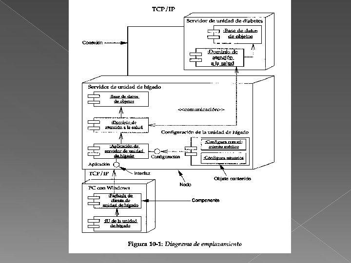 � Cada nodo de un diagrama de emplazamiento representa alguna clase de unidad de cómputo; en la mayoría de los casos se trata de una pieza de hardware. El hardware puede ser un dispositivo o un sensor simple, o puede tratarse de un mainframe (Computadora grande, poderosa y costosa utilizada principalmente en empresas que necesitan procesar gran cantidad de datos o soportar gran cantidad de usuarios. ). Los componentes en un diagrama de emplazamiento representan módulos físicos de código y corresponden exactamente a los paquetes de un diagrama de paquetes de tal modo que el diagrama de emplazamiento muestra dónde se ejecuta cada paquete en el sistema.