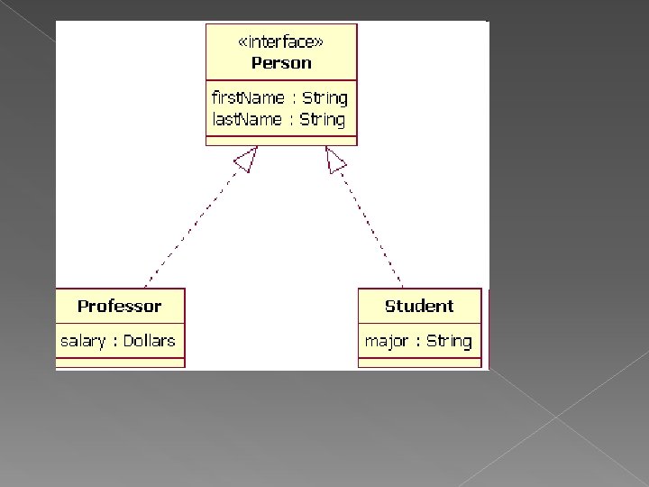 Ejemplo interface En el diagrama anterior las clases Professor y Student implementan a la interface Person y no heredan de ésta, podemos deducirlo a partir de: 1) El objeto Person de acuerdo a la simbología del diagrama está como una interface y Professor y Student están como clases. 2) No se trata de herencia ya que la línea con la flecha está punteada y no sólida.