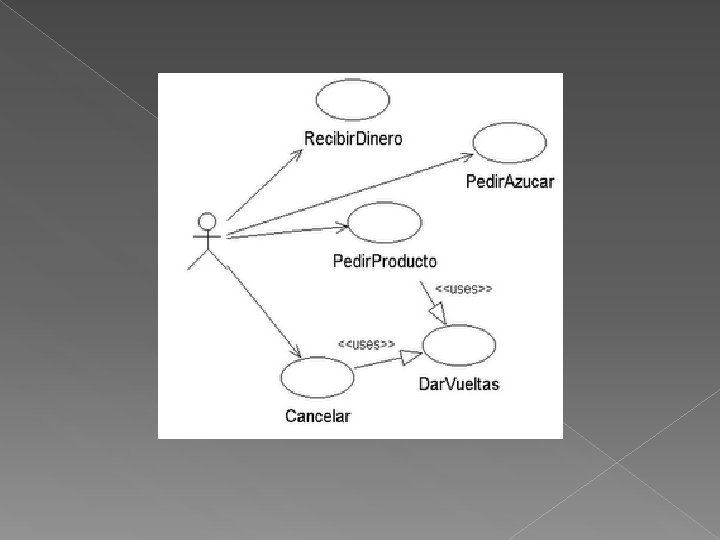�Ejemplo �En el caso del ejemplo se tienen como casos de uso de la cafetera Recibir. Dinero, Pedir. Azucar, Pedir. Producto, Dar. Vueltas y Cancelar.