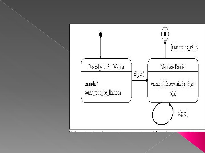 Subestados Un estado puede descomponerse en subestados, con transiciones entre ellos y conexiones al nivel superior. Las conexiones se ven al nivel inferior como estados de inicio o fin, los cuales se suponen conectados a las entradas y salidas del nivel inmediatamente superior. Transacción Compleja Una transición compleja relaciona tres o más estados en una transición de múltiples fuentes y/o múltiples destinos. Representa la subdivisión en threads del control del objeto o una sincronización. Se representa como una línea vertical de la cual salen o entran varias líneas de transición de estado.