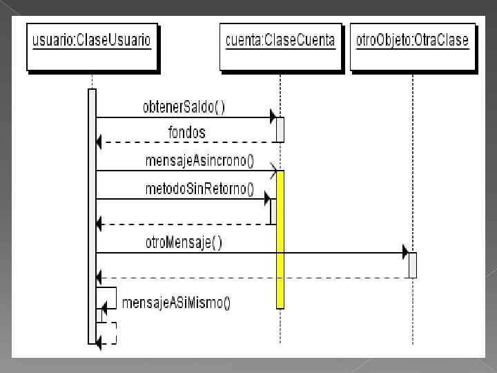 � Asincrónicos: terminan inmediatamente, y crean un nuevo hilo de ejecución dentro de la secuencia. Se representan con flechas con la cabeza abierta. � También se representa la respuesta a un mensaje con una flecha discontinua.