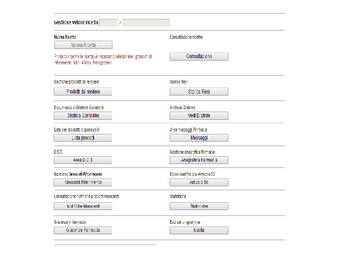 CASI PARTICOLARI : ( possono essere previsti negli accordi per la DPC ) Esempio nella Provincia di Salerno Gestione PRINCIPI ATTIVI MANCANTI attendere la risposta dell’ASL entro 24 ore e successivamente la ricetta può essere spedita in regime SSN 11.